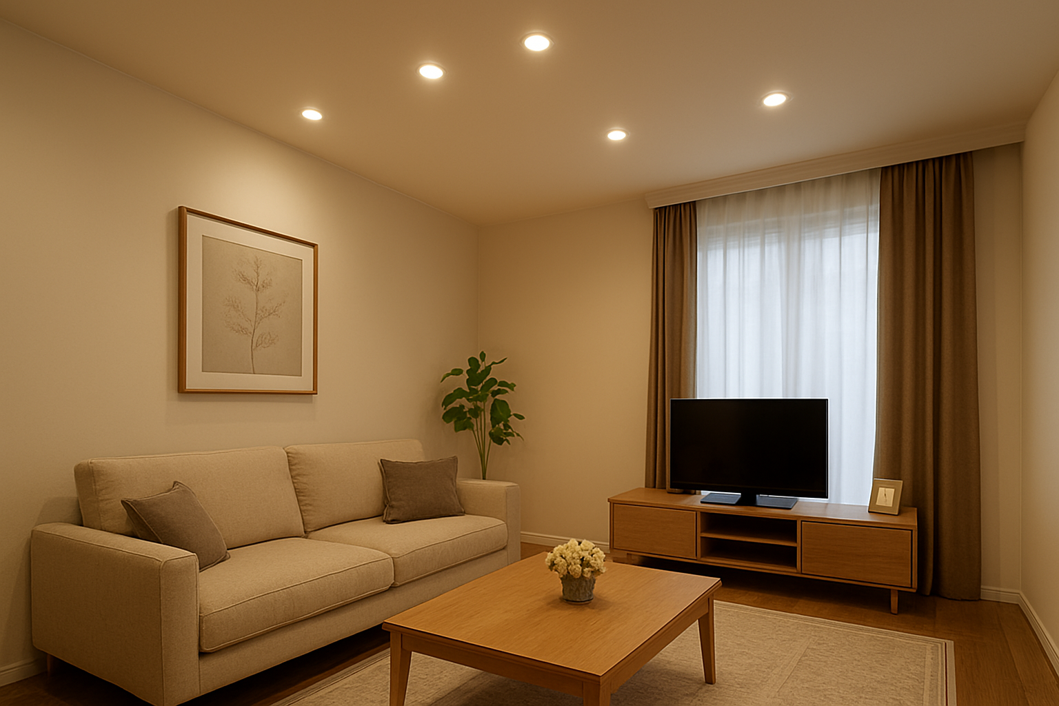 内容:主要な部屋は広いシーリングライトで確保し、アクセント照明や間接照明としてダウンライトを数灯設置