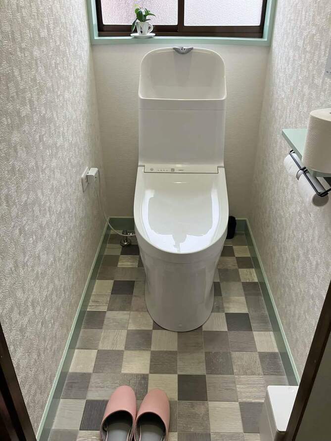 劣化が目立っていたおトイレを新しい一体型のおトイレに交換しました。 すっきりとした見た目で、ホワイト色が良く映えるおトイレになりました! 床は木目調のチェック柄でおしゃれに、窓枠もミント色に塗装し、 おしゃれ且つかわいいおトイレ空間になりました! 【商品】TOTO:ZR2