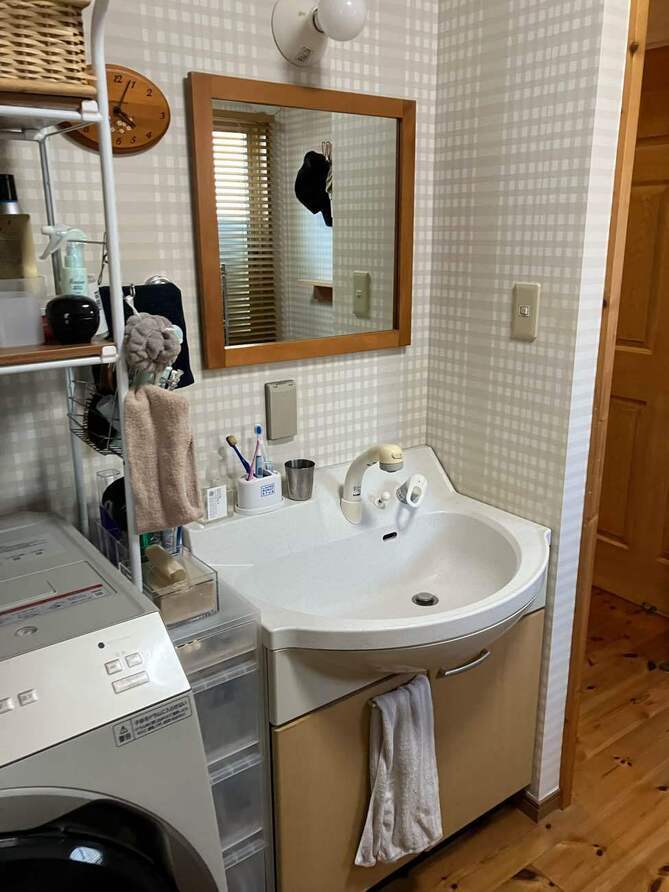 劣化が目立ってきていた洗面化粧台の交換を行いました。 奥行きがコンパクトで脱衣所も広く感じるようになりました! 引出し付きの化粧台なので、小物の収納もラクラクになりました! 【商品】LIXIL:エスタ ボウル一体型(幅:75cm、扉色:クリエラスク)
