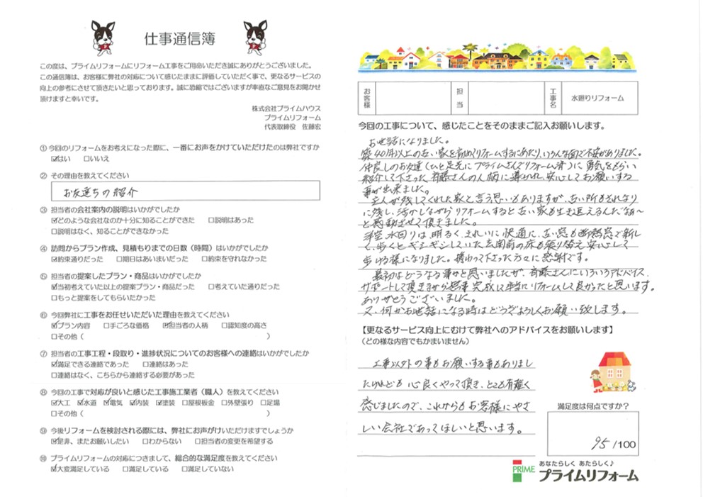 工事以外のこともお願いすることもありましたけれども、快くやっていただき、とてもありがたく感じましたので、これからもお客様に優しい会社であってほしいと思います。